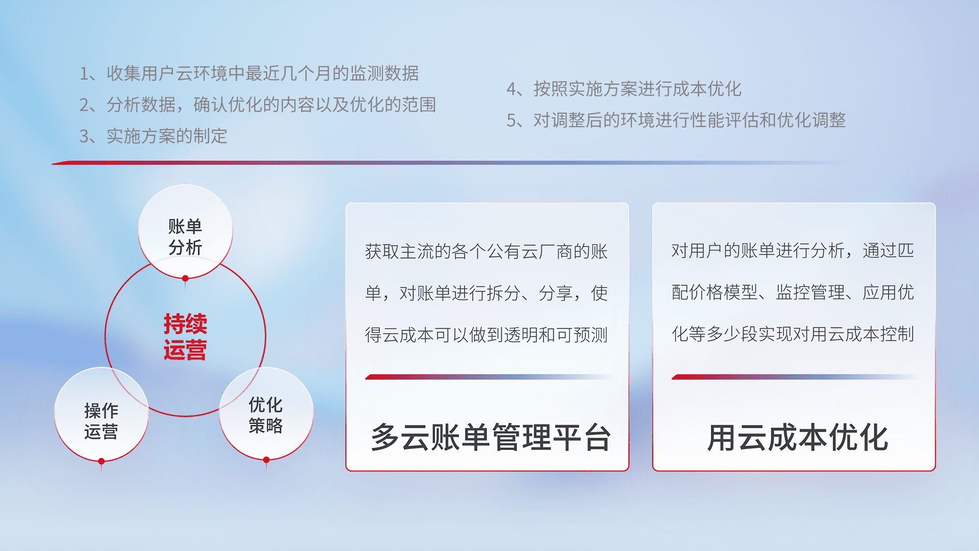 通过灵活运用多种自动化迁移工具,,,,帮助企业用户实现业务和数据高效 、、、稳定的上云迁移和云上迁移,,,采用自研多云纳管平台,,以中立管理模式,,解决多组织、、、、多云、、多运维厂商的复杂关系的管理,,,,保证多云平台资源配置的一致性,,,,实时掌控云资源运行数据,,,运用智能化工具分析云资源多云平台的管理服务,,,,透明化管理成本支出,,,用云成本可预测、、、用云费用可优化、、云资源配额有据可依。。。。