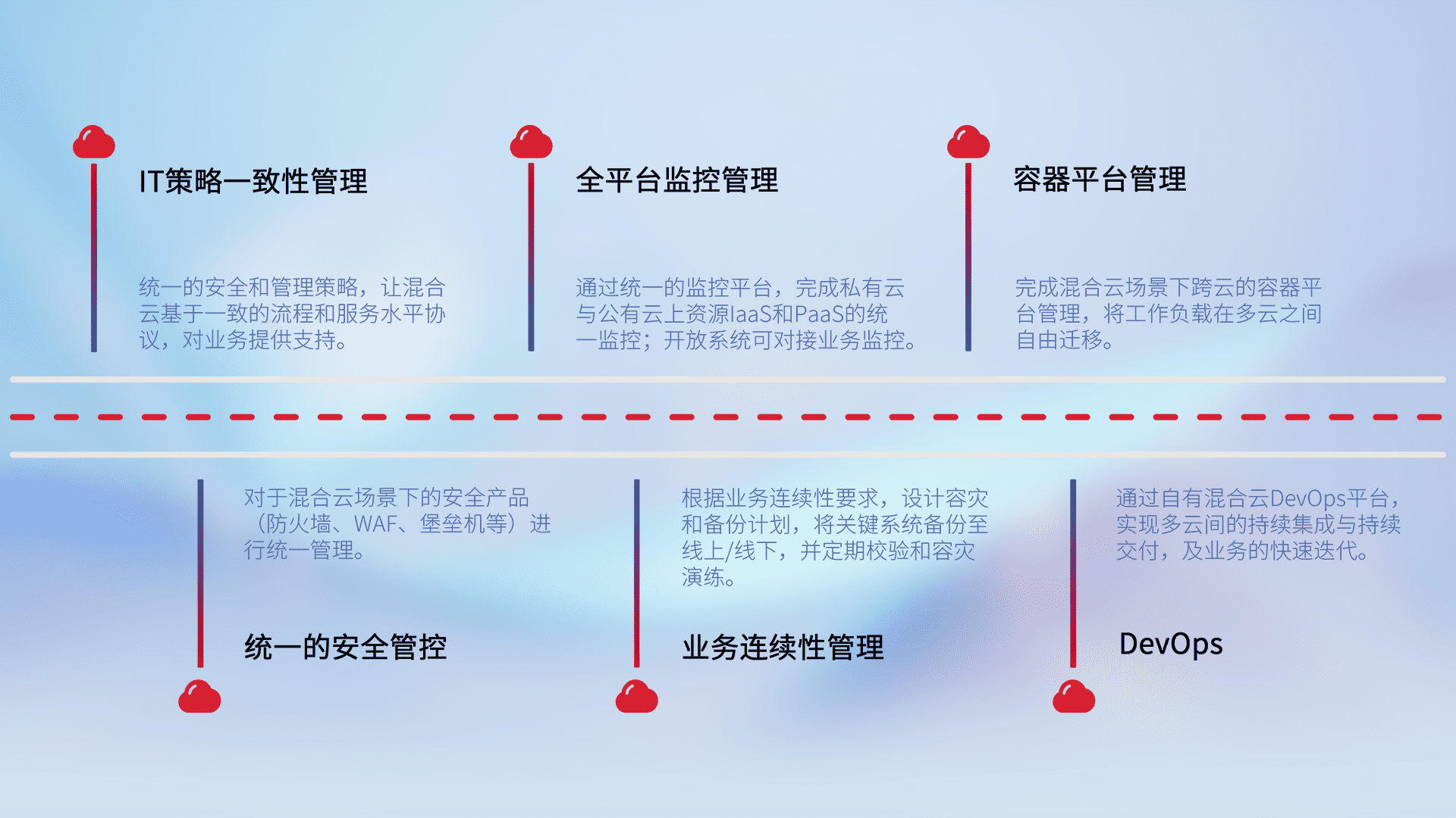 通过多云纳管,,,以统一的资源数据模型把客户的云资源进行抽象和封装,,,进而实现对多云资源的统一操作,,,,保障云资源管理的可靠性、、、稳定性与可用性。。。量身定制化运维内容,,,配置、、、开发运维、、、、补丁管理、、、备份、、、、监控、、、、认证和访问管理、、、审计和日常巡检等,,,,保障在用云过程中的可靠度,,稳定度以及高可用率。。。。