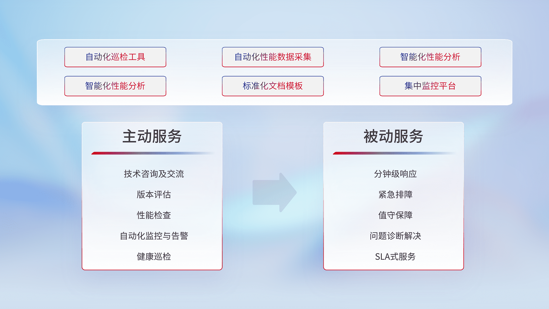 智能化工具和标准化文档,,,保障服务质量,,,,提供主动服务(包含技术咨询、、、版本评估、、性能检查、、、、自动化监控与告警、、健康巡检)和被动服务包含(分钟级响应、、、紧急排障、、、、值守保障、、、问题诊断解决、、SLA服务)。。。