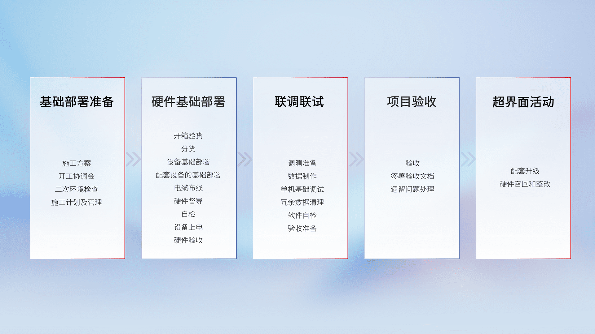 从基础部署准备、、硬件基础部署、、、联调联试、、、、项目验收、、越界面活动的全过程可追溯,,,保证施工质量和进度。。。。